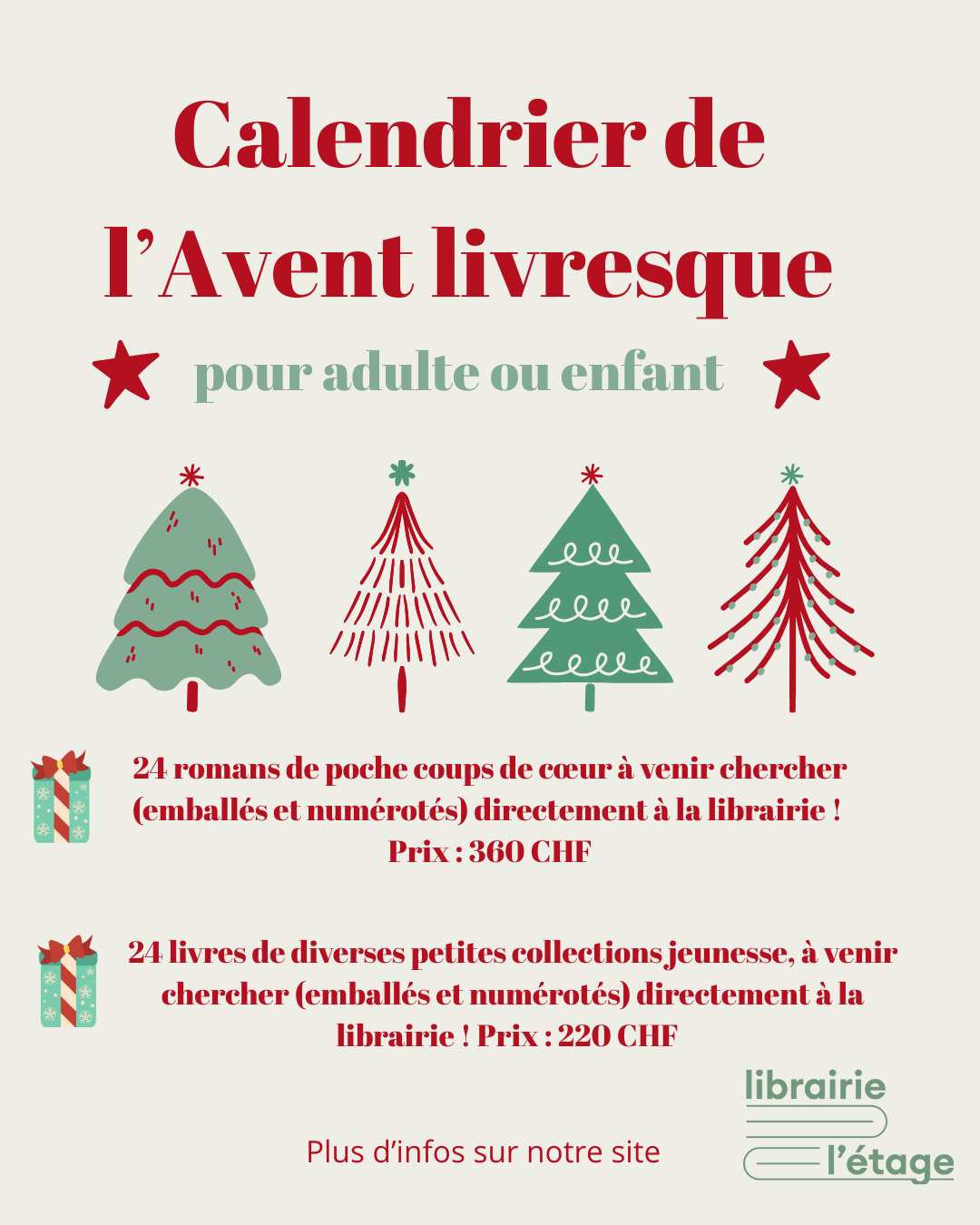 !! réservation jusqu’au 25 novembre 2025 !! Pour la fin de l’année, la librairie l’étage vous propose d’offrir un CALENDRIER DE L’AVENT LIVRESQUE pour adulte ou pour enfant. POUR ADULTE POUR ENFANT (adapté selon l’âge) 24 romans de poche coups de cœur à venir chercher (emballés et numérotés) directement à la librairie ! Prix : 360 CHF 24 livres de diverses petites collections jeunesse, à venir chercher (emballés et numérotés)...