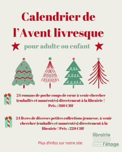 Pour la fin de l’année, la librairie l’étage vous propose d’offrir un CALENDRIER DE L’AVENT LIVRESQUE pour adulte ou pour enfant.